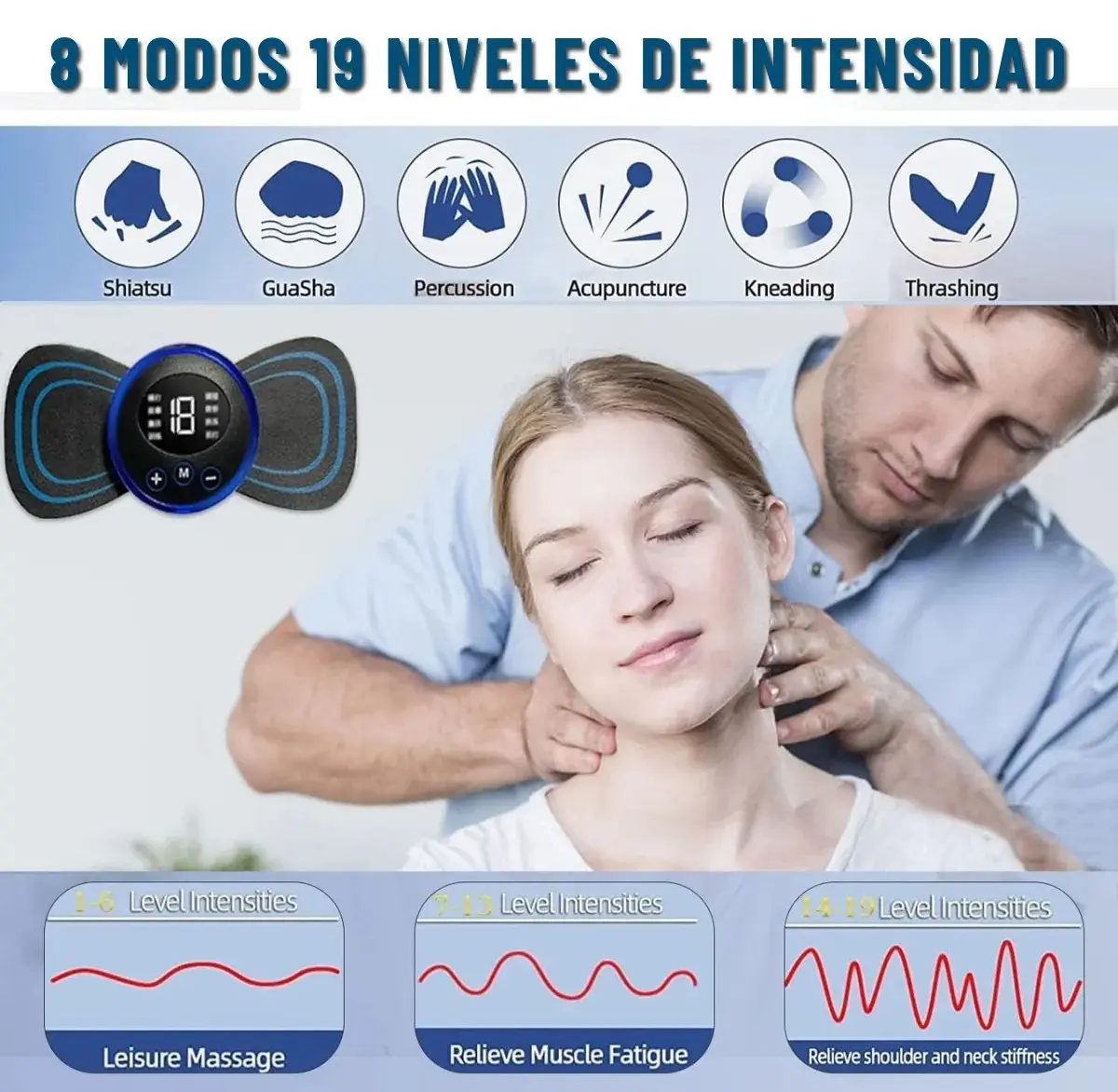 Con 8 modalidades y 19 niveles de intensidad, se adapta a cualquier necesidad: relajación, tonificación o alivio muscular.